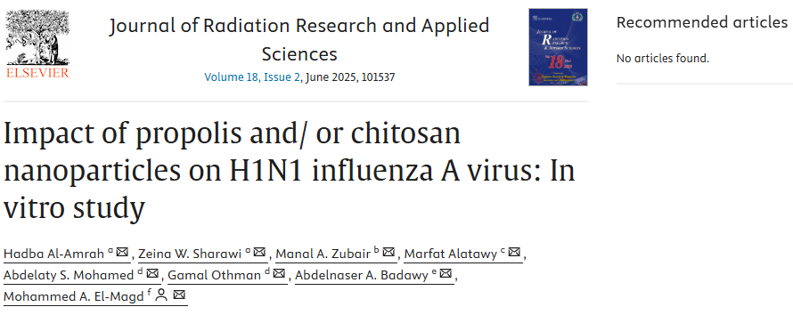 本研究內容基于發(fā)表于《Journal of Radiation Research and Applied Sciences》的論文(Impact of propolis and/ or chitosan nanoparticles on H1N1 influenza A virus: In vitro study,DOI:10.1016/j.jrras.2025.101537),由沙特阿拉伯與埃及多所大學聯(lián)合完成。